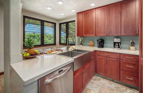 Proudly managed by Suite Paradise Poipu If you are looking for a special place for an unforgettable honeymoon, romantic getaway, or a family vacation where anyone from grandparents, young children, and teenagers can be comfortable, then Lawai Beach 1401 is the place for you! This unit is one of the few at Lawai Beach that is owned by individual homeowners, as opposed to timeshare ownership, so you will feel and see the owners' personalized treatment of their condo. From your perch at the top floor, you will have a magnificent view of the garden and the blue Pacific across the street; where you can watch amazing sunrises and sunsets as you sip your tropical drink or morning coffee. Although snorkeling is a popular activity across the street, that is just a sampling of the myriad of ocean/water activities that you can experience throughout the island. The stretch of road as you turn right from the resort is perfect for morning runs or walks and leads to one of Kauai's natural wonders - Spouting Horn. The unit itself is a comfortable home away from home, featuring a kitchen that is fully equipped with a full-size refrigerator, dishwasher, range/oven, microwave, and the ever-important blender for mixing drinks, pots, dishes, and glassware. A washer/dryer is also provided for your convenience. There are 2 bathrooms and the master suite offers a Cal King bed and ocean view while the guest bedroom has two full-size beds. The open floor plan of the living room makes it possible to see the ocean from the kitchen. There are three pools and hot tubs, a fitness center, a mini-golf course, and barbecue grills. You will find incredible value, luxury, and relaxation during your stay here at Lawai Beach, allowing you to truly understand the meaning of “Hawaii Time.”
